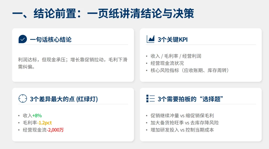 例:利润达标,但现金承压;增长靠促销,毛利在下滑。