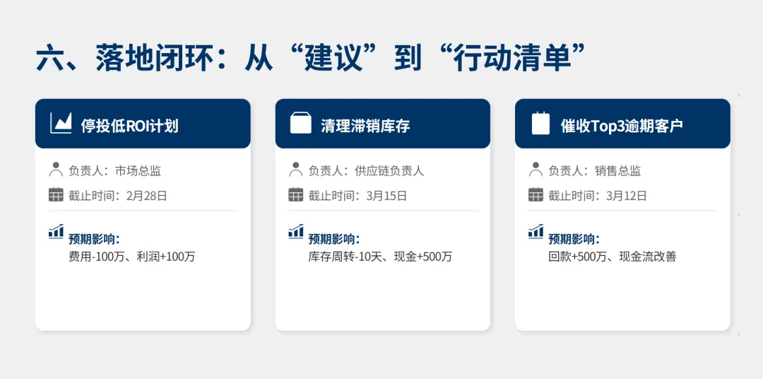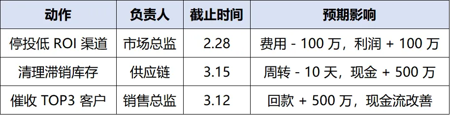 动作 → 负责人 → 截止时间 → 预期影响