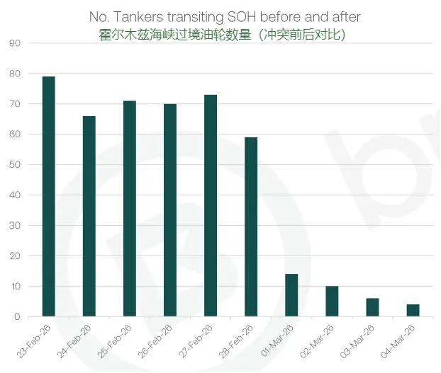 受保赔协会(P&I club)承保人终止战争险保障并大幅提高保费影响,霍尔木兹海峡的油轮通航于 3 月 1 日(周日)凌晨全面停滞。