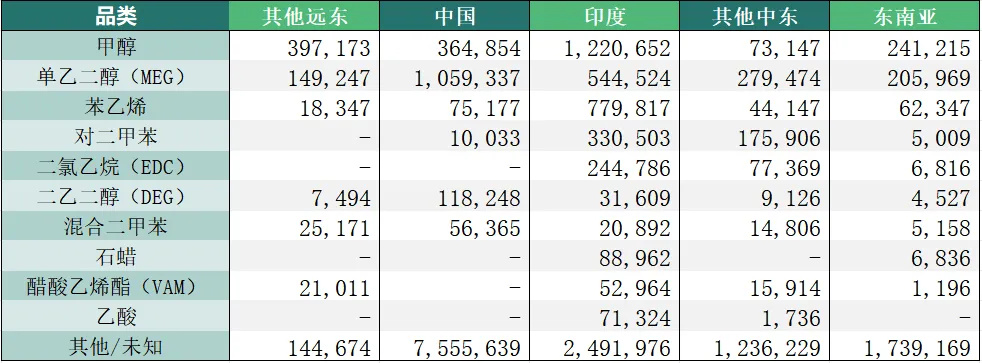 2025 年阿拉伯湾化学品出口情况(不含伊朗、阿曼、巴基斯坦)