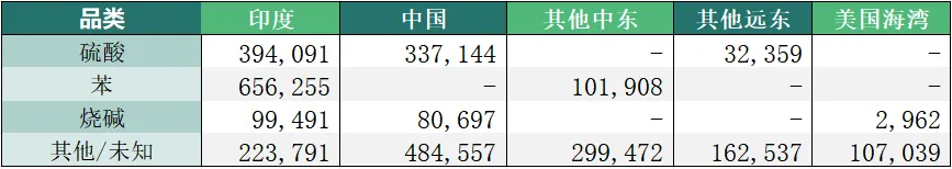 尽管阿拉伯湾的化工品进口量相对较小,但如果海湾国家无法通过非海湾港口经陆路进口相关产品,这些产品将在全球市场出现供应增加,进而对印度和中国的硫酸离岸价,以及印度和中东的苯离岸价形成下行压力。因阿拉伯湾的进口量占硫酸长途运输总量的8%和占苯长途运输总量的 22%。而更长途航运航线贸易的出现,将提高化学品油轮的运营收益。
