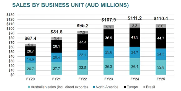 2025财年SDI业绩表现相对平淡,实现营收1.104亿澳元,下降0.7%;实现息税折旧摊销前利润2130万澳元,下降2.7%;税后净利润1050万澳元,增长0.1%。