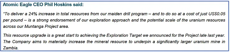 【异动股】Atomic Eagle Ltd (ASX:AEU) Muntanga铀项目首次钻探实现资源量增长24% “发现成本”仅每磅0.05美元