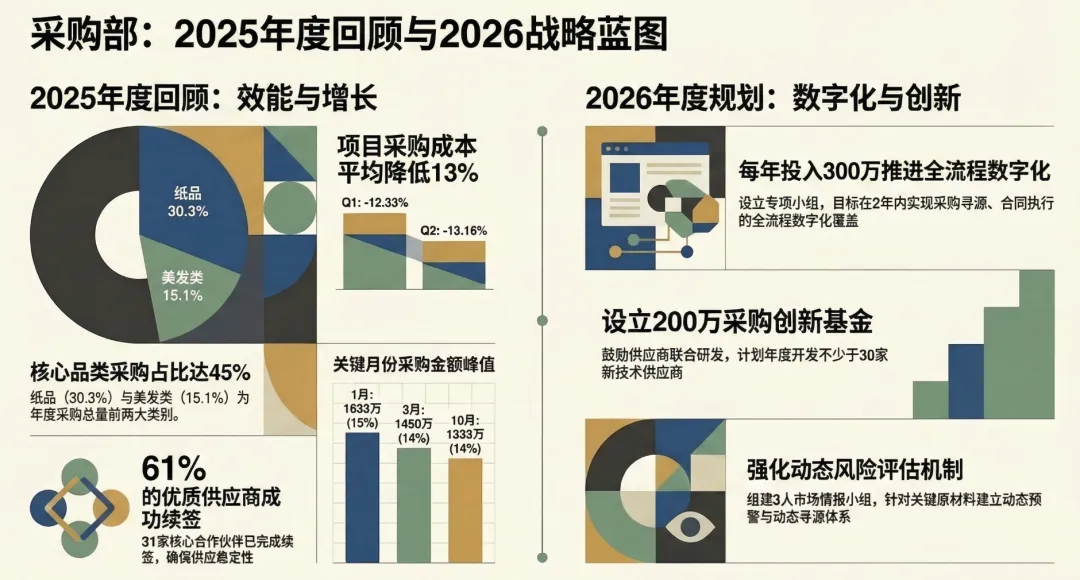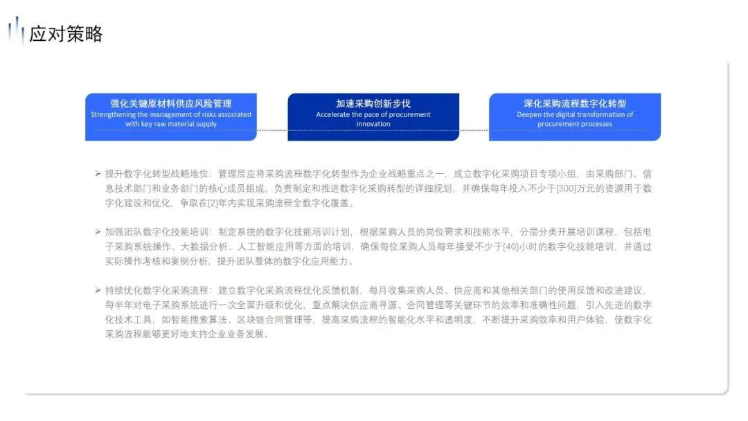 第三仗:全面拥抱数字化,完成降维打击。我们将把数字化提升到战略生命线的高度。每年砸下不少于300万元的重金,争取2年内实现采购流程的全数字化覆盖。从智能搜索算法到区块链合同管理,我们要彻底消灭人工流程带来的低效与风险。全员每年必须完成40小时以上的数字化闭门培训,跟不上迭代的人,只能掉队。