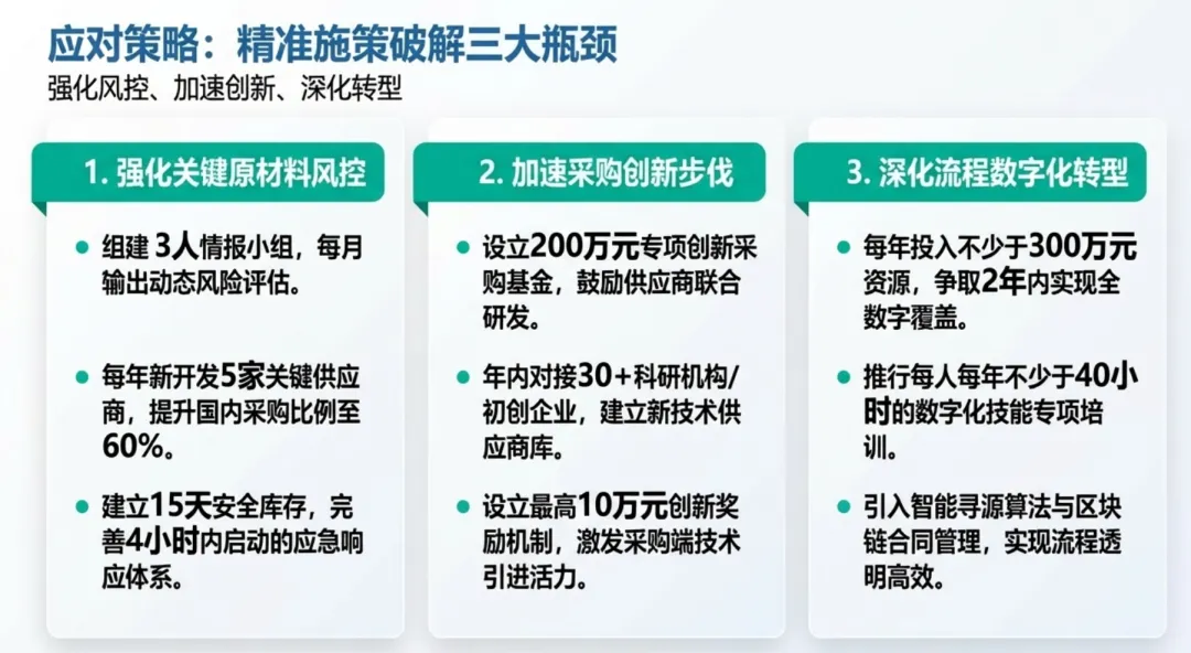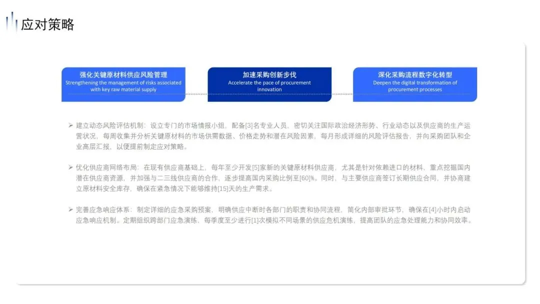 第一仗:用“极限生存”的底线思维,重构供应链韧性。不再抱有任何侥幸心理。我们将成立3人市场情报专班,建立动态风险评估机制。每年强制开发5家新供应商,死磕国内采购比例提升至60%,并建立15天的安全库存红线。一旦发生断供危机,我们必须在4小时内启动应急响应。