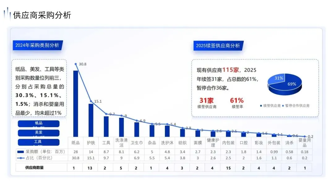 今年,我们在供应商大盘上做了一次极度的精简与聚焦。面对115家现有供应商,我们没有妥协,坚决暂停了36家不合格供应商的合作,只留下31家优质伙伴重点续签。