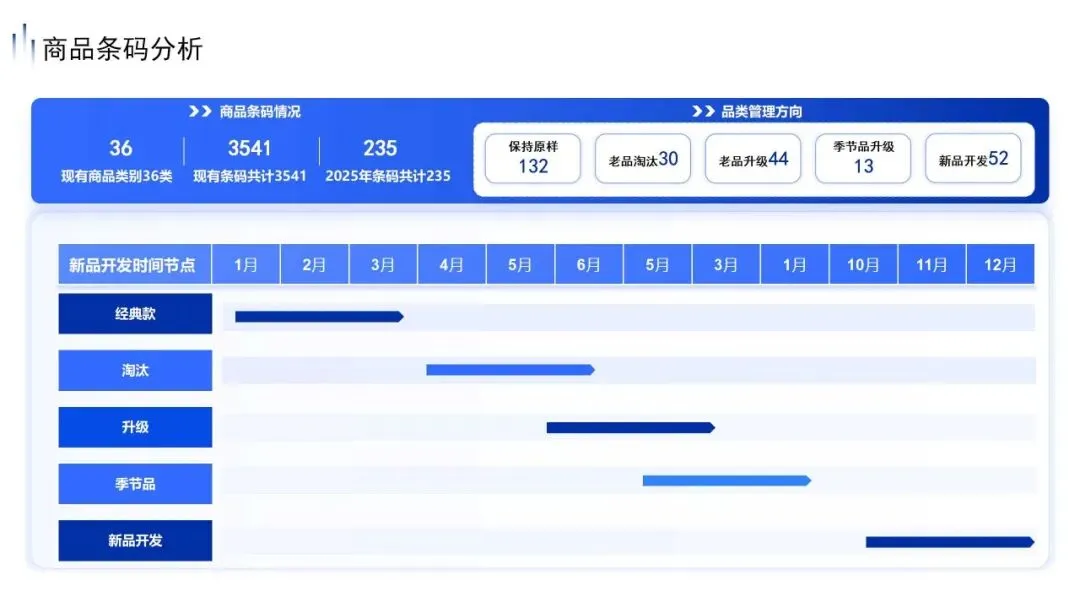 在商品条码上,我们不再做毫无意义的堆砌,而是建立起残酷的优胜劣汰机制:坚决淘汰30个老品,升级44个老品,并强力推动52个新品的开发。