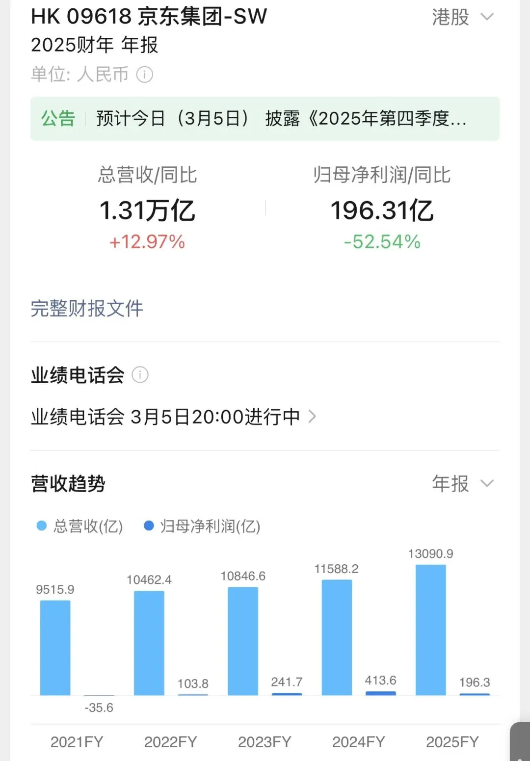 3月5日,京东集团发布2025年业绩公告,一组数据让市场哗然: