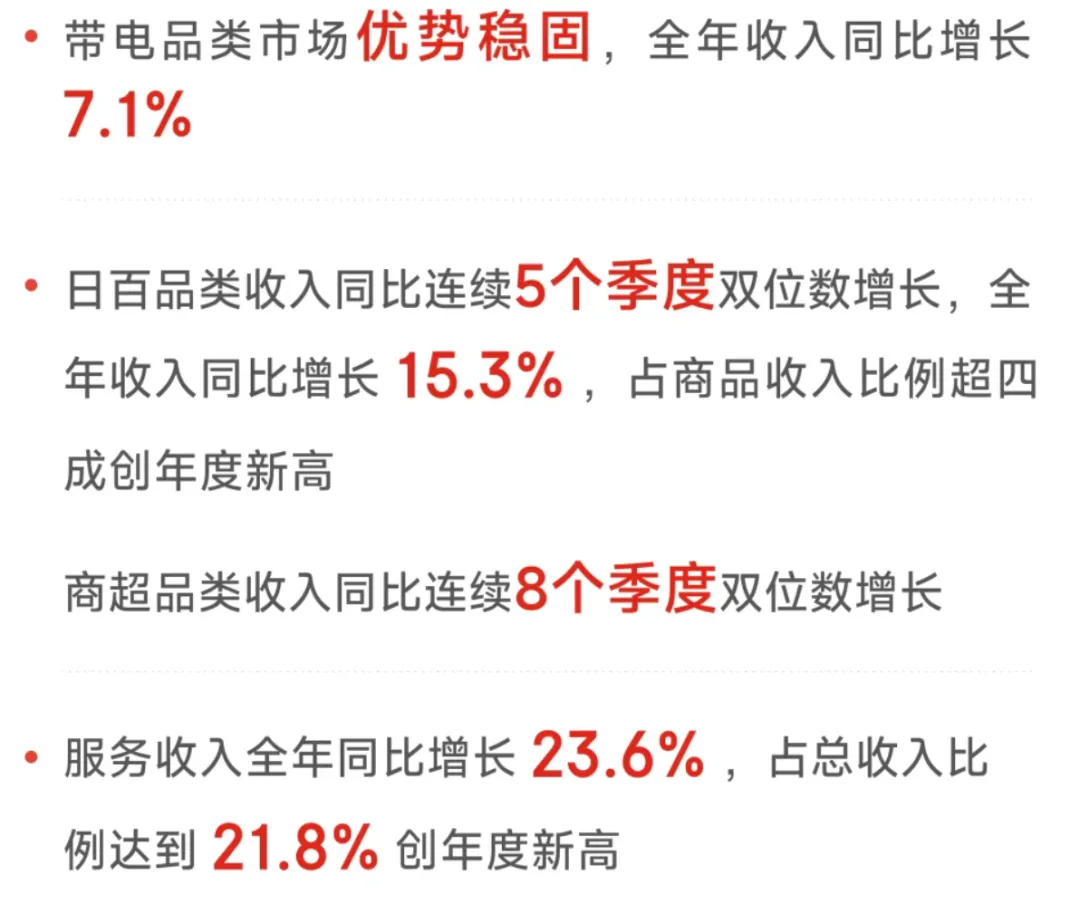家电、3C等传统优势品类在行业低价竞争中稳住市场份额,日百、商超等高频刚需品类更是实现高速增长,成为零售板块的新增长引擎。