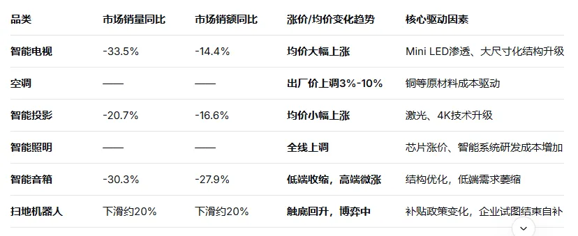 2026年初主要智能家居品类价格变动汇总表