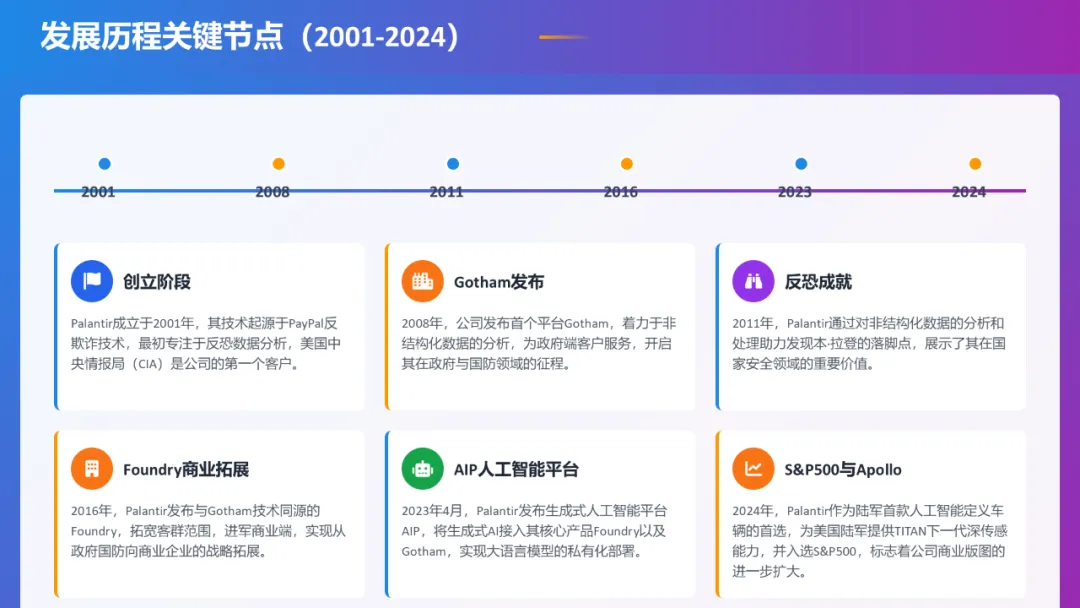 Palantir 成立于 2001 年,其技术起源于 PayPal 反欺诈技术,最初专注于反恐数据分析,美国中央情报局(CIA)是公司的第一个客户。2008 年,公司发布首个平台 Gotham,着力于非结构化数据的分析,为政府端客户服务;2011 年,通过对非结构化数据的分析和处理助力发现本・拉登的落脚点;2016 年,发布与 Gotham 技术同源的 Foundry,拓宽客群范围,进军商业端;2021 年,Apollo 产品上线,旨在所有环境中实现产品的高效部署及更新;2023 年 4 月,发布生成式人工智能平台 AIP(Artificial Intelligence Platform),将生成式 AI 接入其核心产品 Foundry 以及 Gotham,实现大语言模型的私有化部署;2024 年,作为陆军首款人工智能定义车辆的首选,为美国陆军提供 TITAN 下一代深传感能力,并入选 S&P500。