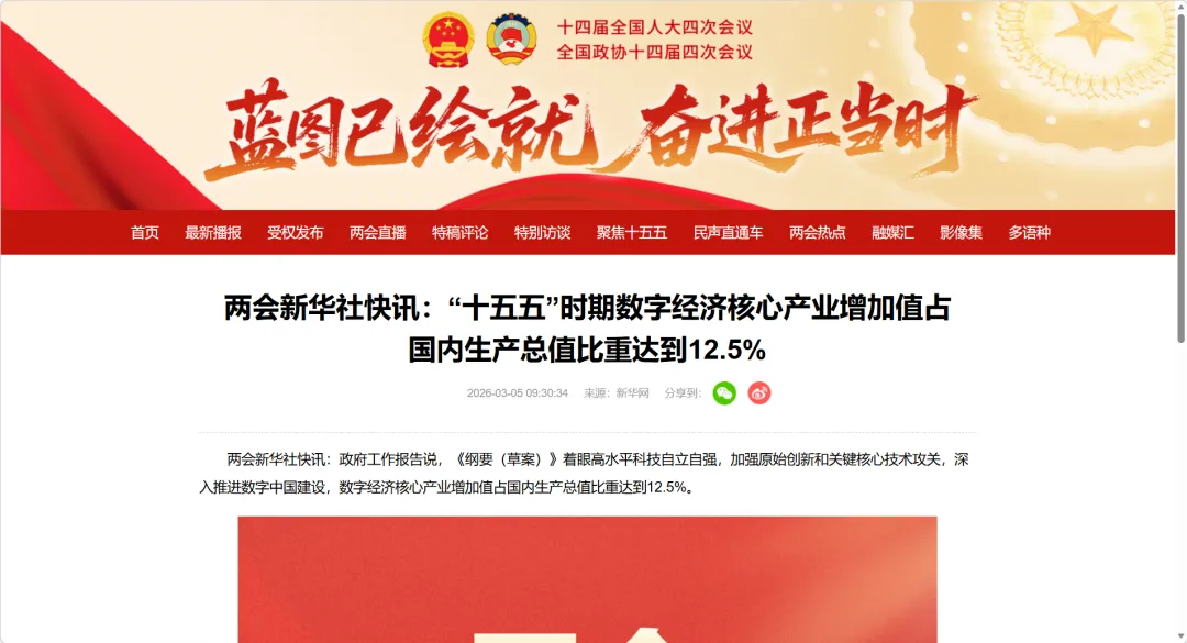 3月5日上午,十四届全国人大四次会议在人民大会堂开幕,国务院总理李强作政府工作报告。 在这份报告里,一个容易被忽略却足够“硬”的表述是:在“十五五”重大战略任务中提出“深入推进数字中国建设”,并明确“数字经济核心产业增加值占国内生产总值比重达到12.5%”。 这意味着,数字经济不再只是一句方向性口号,而被放置在中长期结构优化的指标体系中,指向“数字产业本身要做大”的政策期待。