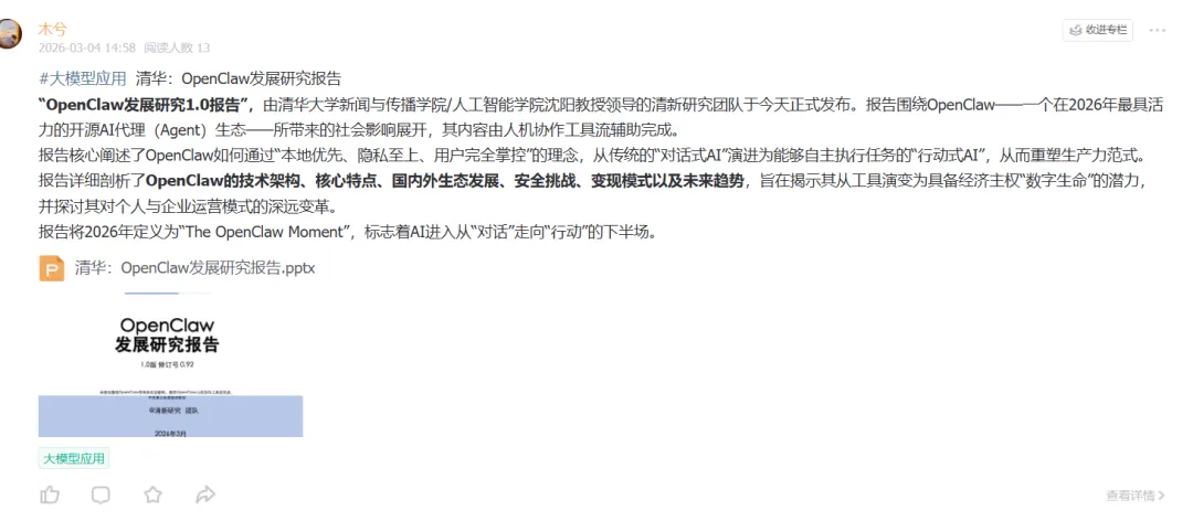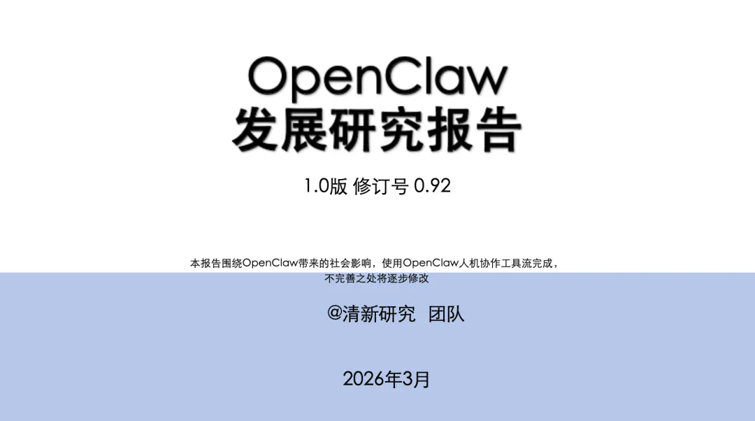 《OpenClaw发展研究报告1.0》是清华大学清新研究团队(人类学术团队)主导的研究成果,由沈阳教授带领的跨学科团队完成,研究过程中虽使用OpenClaw人机协作工具流辅助资料检索、排版润色等工作,但核心的研究框架设计、内容分析、结论提炼与关键内容把关均由人工完成,是典型的“人类主导+AI辅助”的学术研究模式。