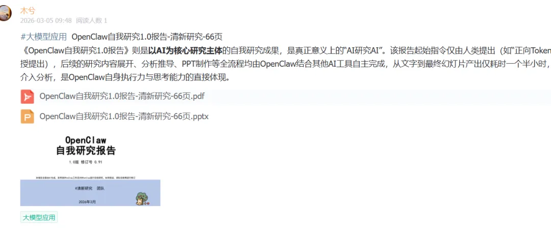 《OpenClaw自我研究1.0报告》则是以AI为核心研究主体的自我研究成果,是真正意义上的“AI研究AI”。该报告起始指令仅由人类提出(如“正向Token流”概念由沈阳教授提出),后续的研究内容展开、分析推导、PPT制作等全流程均由OpenClaw结合其他AI工具自主完成,从文字到最终幻灯片产出仅耗时一个半小时,全程无人工深度介入分析,是OpenClaw自身执行力与思考能力的直接体现。