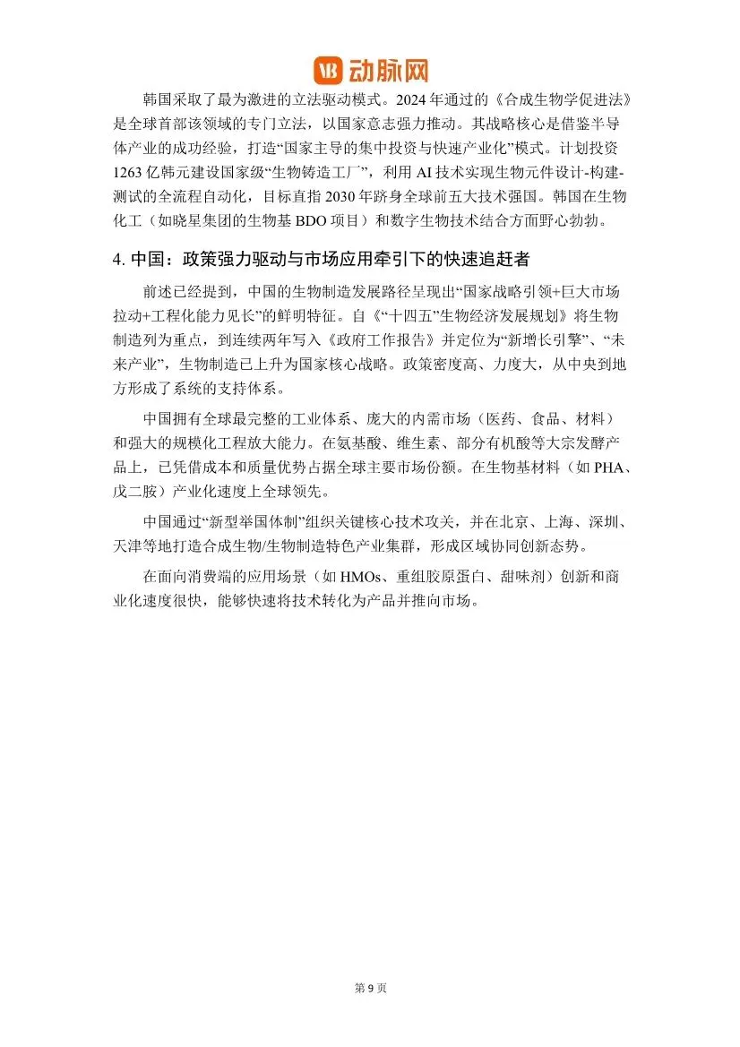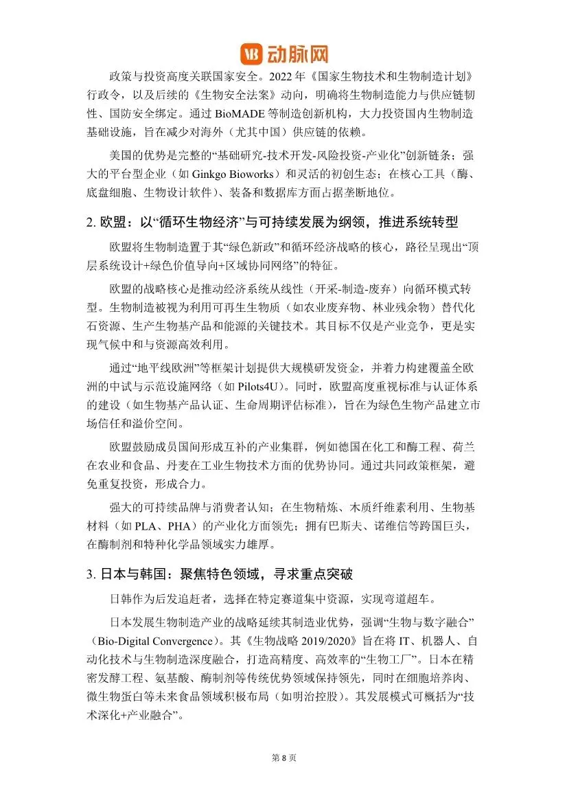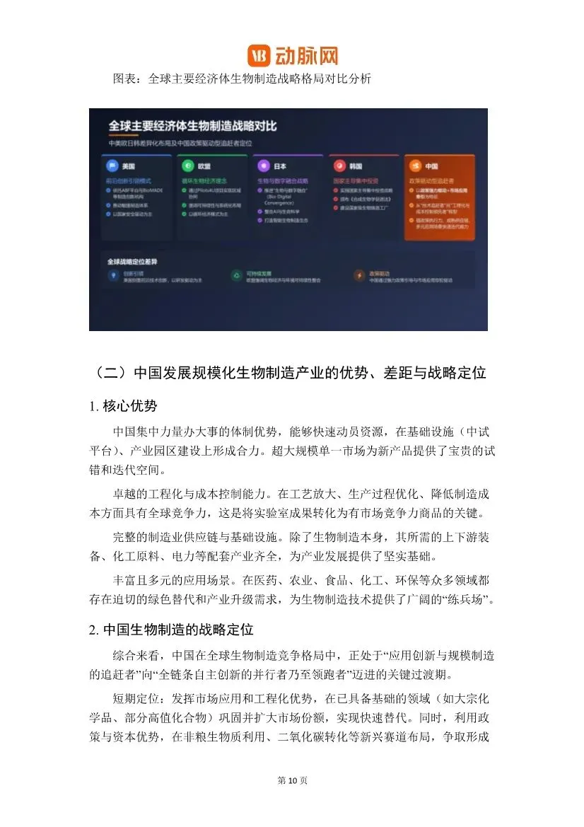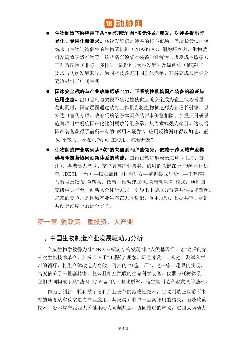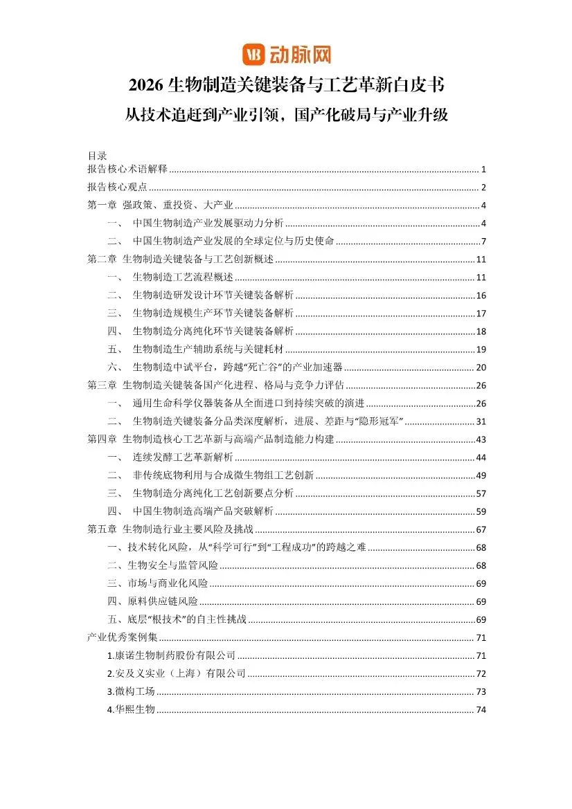 这份由动脉网发布的《2026生物制造关键装备与工艺革新白皮书》,对中国生物制造产业,特别是其核心装备与工艺的现状、挑战与未来方向进行了全面而深入的剖析。以下是对该白皮书核心内容的解读与分析:一、核心观点:国产化呈现“橄榄型”结构,安全可控与“换道超车”成新驱动力白皮书开宗明义地指出,中国生物制造关键装备的国产化进程呈现出 “中间强、两端弱”的橄榄型结构。• 中游整机制造(如不锈钢生物反应器、通用色谱系统)国产化率已较高(部分超60%),实现了规模化替代。• 上游核心原材料与部件(如高精度层析填料、纳滤膜材、在线传感器、质谱仪核心部件)进口依赖度仍高,是供应链安全的“卡脖子”环节。• 下游工艺与智能化解决方案(如连续制造整体工艺包、AI过程控制软件、数字化工厂交付能力)仍严重缺失,构成产业升级的“能力鸿沟”。报告强调,国产替代的核心驱动力已从过去的“成本优先”全面转向 “安全可控”与“技术窗口”双重逻辑。地缘政治与出口管制倒逼供应链安全成为“必选项”,而在连续化、智能化等新兴技术范式上,国内外起步差距相对较小,为中国产业提供了“换道超车”的战略窗口。二、产业发展背景:四大驱动力同频共振,中国定位清晰中国生物制造产业的快速发展是政策、技术、资本与市场四大驱动力协同作用的结果。• 政策导航:从国家顶层战略(如“十四五”生物经济发展规划)到地方精准布局,形成了密集的支持体系。• 技术内核:合成生物学、基因编辑、AI与自动化技术极大提升了研发效率。• 资本燃料:风险投资、国家基金与资本市场改革提供了长期资金支持。• 市场牵引:在医药、材料、消费等领域的巨大替代和创造潜力,构成了终极吸引力。在全球定位上,中国正处于从 “应用创新与规模制造的追赶者”向“全链条自主创新的并行者”迈进的关键期。其核心优势在于强大的工程化与成本控制能力、完整的制造业供应链以及庞大的内需市场。三、全球竞争格局:路径各异,中国发挥工程与市场优势• 美国:以“前沿创新+敏捷制造+国家安全”为核心,构建领先生态。• 欧盟:以“循环生物经济”为纲领,推进系统转型和绿色标准。• 日韩:聚焦特色领域(如日韩的“生物-数字融合”、韩国的立法驱动模式),寻求重点突破。• 中国:路径特征是“国家战略引领+巨大市场拉动+工程化能力见长”,在规模化生产与应用创新上速度快。报告通过详细的矩阵图,分类评估了关键装备的国产化进展:1. 生物反应器系统:国产化主力军。不锈钢反应器国产化率高(约85%);一次性生物反应器(SUB)发展迅猛,国产化率已从极低水平快速提升至超过65%,但核心反应袋膜材仍是“卡脖子”环节;用于研发的高通量微型生物反应器则仍严重依赖进口。2. 分离纯化系统:攻坚最深水区。硬件系统(如层析系统)国产化取得一定进展,但核心耗材色谱填料/层析介质(尤其是ProteinA亲和填料)和过滤膜材仍是最大短板,严重依赖进口,是产业链安全的关键风险点。3. 过程控制与监测系统:智能化短板明显。通用控制系统正在突破,但用于实时监控和优化的高级过程分析技术(PAT)传感器、生物过程专用软件及AI模型,与国际顶尖水平差距显著。4. 关键耗材与原材料:点状突破,链式脆弱。无血清培养基国产化率已较高(超过65%),但在微载体、部分高性能膜材等方面仍依赖进口。1. 连续生物制造(CBP):被视为颠覆性的工艺方向。相比传统批次发酵,连续工艺在设备利用率、生产成本(可降30%-40%)、产品质量一致性及环保方面优势显著。报告指出,中国在动物细胞灌注培养、微生物连续发酵等领域已取得实质性突破,是未来实现非对称超越的关键赛道。2. 非传统底物利用与合成微生物组:为破解“与人争粮”和实现“双碳”目标,利用秸秆、二氧化碳、工业废气等非粮原料成为战略重点。与之协同发展的合成微生物组技术,通过设计多菌群协同系统,实现对复杂原料的高效转化,代表了工艺创新的前沿。3. 智能化赋能:AI和数字孪生技术正贯穿全链条。在研发端,AI用于蛋白质设计、路径优化;在生产端,数字孪生和智能控制致力于实现过程的精准预测与优化,解决“放大效应”难题。• 分离纯化工艺:成本占比高,其创新正向连续化、集成化、智能化方向发展。国产替代在设备硬件上进展较快,但在核心分离介质和膜材料上仍需突破。• 高端产品突破:中国已在重组胶原蛋白、透明质酸、稀有活性成分(如麦角硫因、HMOs) 等多个高附加值产品领域实现全球领先,不仅完成了进口替代,更开始重塑全球供应链和标准制定权。这证明了生物制造技术可创造巨大的市场价值。1. 技术转化风险:从实验室到工厂的“死亡谷”,放大效应和上下游工艺集成是主要难点。2. 生物安全与监管风险:新兴技术带来的“两用性”和环境释放风险,需前瞻性监管框架。3. 市场与商业化风险:成本竞争力构筑周期长,市场准入和消费者接受度存在不确定性。4. 原料供应链风险:对粮食原料的依赖以及非粮原料经济性转化的挑战。5. 底层“根技术”自主性挑战:上游研发工具(软件、数据库)、核心装备部件仍存“卡脖子”环节。• 中试平台:被强调为跨越“死亡谷”的产业加速器。报告指出,平台建设正从1.0时期的“硬件堆砌”转向2.0时期的“精细化运营与价值创造