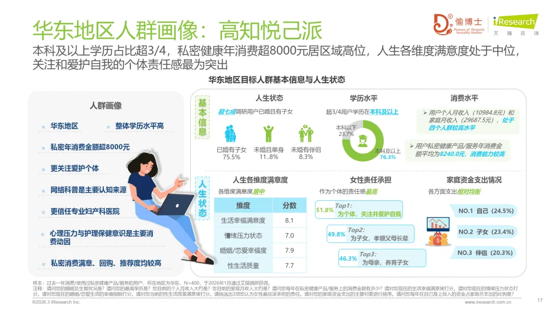 调研显示,女性私密健康面临以羞耻感为核心的多重困境,生理上盆底功能障碍、妇科炎症等问题高发,心理与行为层面的回避又加剧问题恶化,形成恶性循环。调研用户以已婚育女性为主,本科及以上学历、中高收入群体占比高,华东、华南、西南、中部及北方地区呈现鲜明的人群特征,如华东高知悦己、中部及北方消费能力最高。女性整体生活幸福度较高,但超七成存在生活不适,工作压力、家庭与人际关系是主要来源,且情绪压力随年龄增长逐渐降低,自我关注成为女性首要责任认知,但家庭责任分担仍存在认知与行动的落差。
