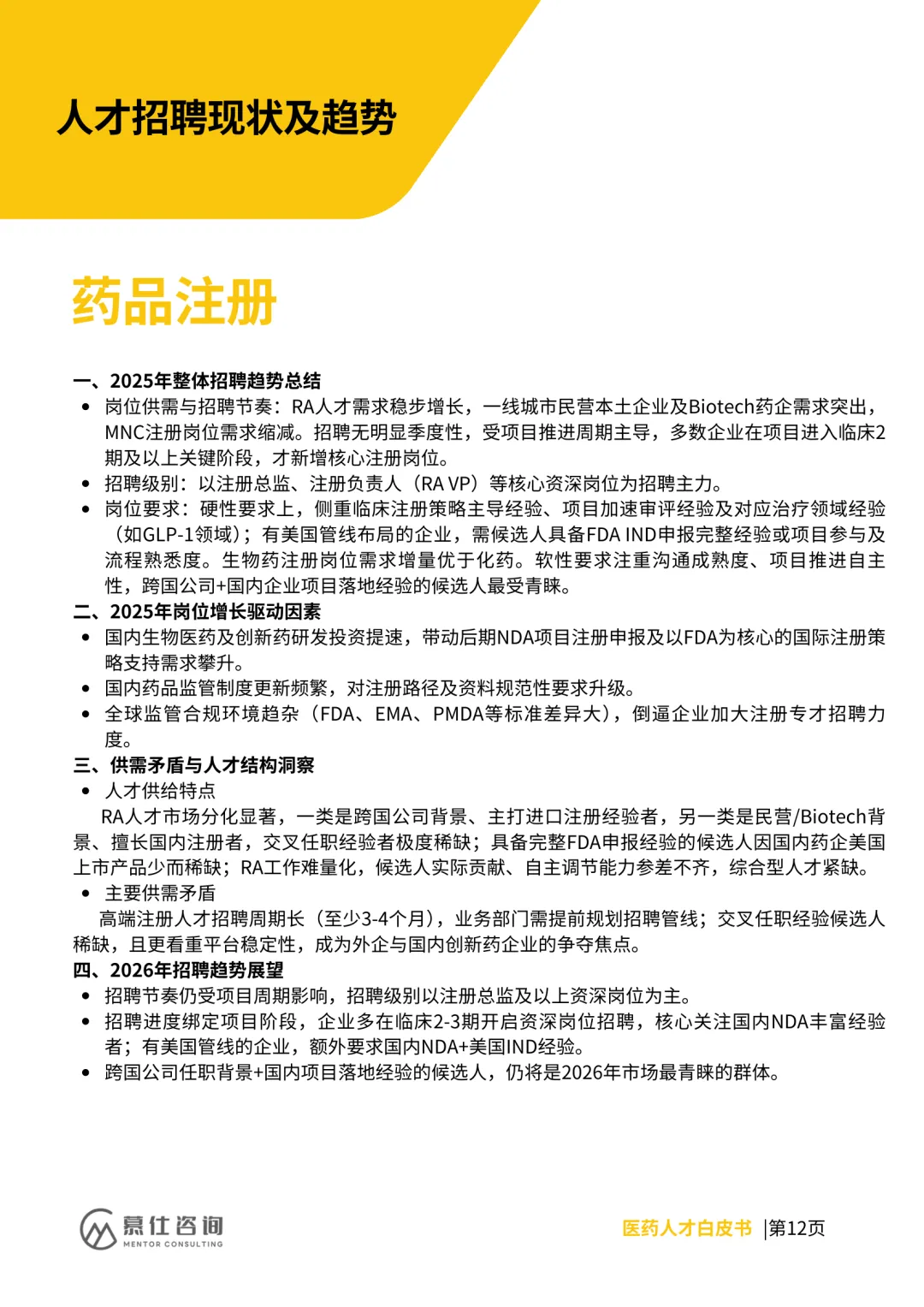 2026年医药行业人才调薪情况显示,整体薪酬调整趋于保守。调研覆盖43家医药公司,涉及11个核心职位板块及4类企业类型,样本具有广泛代表性。跨国药企(MNC)调薪力度最大,预期范围为2%-8%,其中3%-5%为最常见区间。生物制药企业(Biopharma)与民营本土企业调薪预期相近,集中在0%-6%,以3%-5%为主。生物技术公司(Biotech)则相对保守,82%的企业调薪比例在0%-6%,部分尚未明确计划。不同岗位的调薪预期存在差异。早研和临床医学领域,MNC调薪幅度较高,分别为3%-8%和3%-5%;而生产、药品注册等岗位,MNC调薪区间为2%-5%。临床运营和市场相关岗位,调薪幅度普遍较低,多数在0%-3%之间。68%的企业调薪预期控制在0%-6%,反映出行业在2026年对薪酬调整持谨慎态度。
