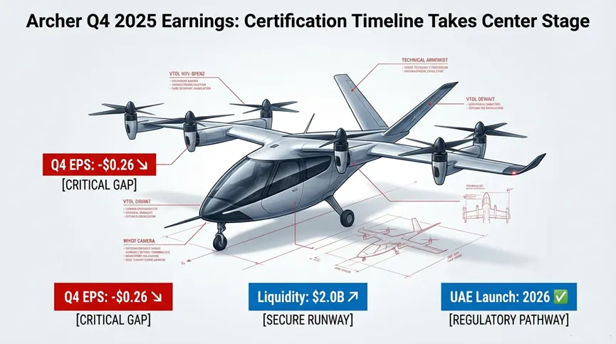2026年3月3日,Archer Aviation发布2025年第四季度财报,公司每股净亏损0.26美元,略高于市场预期的0.24美元,导致盘后股价下跌约6%。但真正引发投资者担忧的,并非这0.02美元的每股收益差额,而是远超预期的2026年第一季度业绩指引——公司预计调整后EBITDA亏损将在1.6亿至1.8亿美元之间,大幅高于分析师预测的约1.1亿美元,这一“指引缺口”成为拖累股价的核心因素。