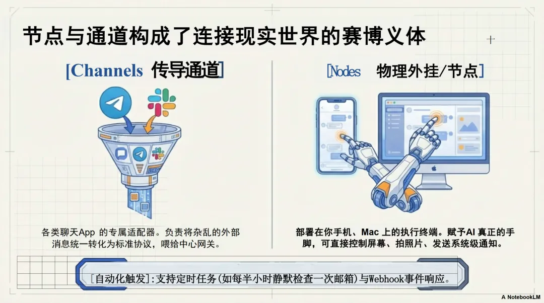 节点与通道 (Nodes & Channels):作为连接物理世界的“赛博义体”。节点是部署在手机、电脑上的执行终端,通道是适配各类聊天软件的接口。