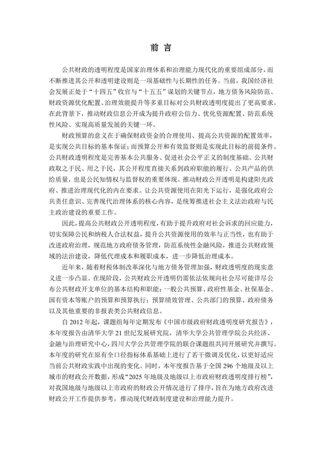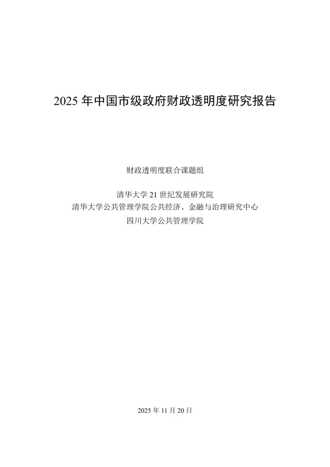 本报告由清华大学 21 世纪发展研究院等联合课题组编制,聚焦 “十四五” 收官与 “十五五” 谋划关键节点的市级政府财政透明度建设。基于全国 296 个地级及以上城市的财政公开数据,以 “全口径、一站式、用户友好” 为核心原则,从机构设置、预算与预算执行、其他重要财政信息三大维度构建评价体系,形成透明度排行榜,剖析各地财政公开现状、差异与问题,提供良好实践指南,为推进公共财政公开、防范债务风险、提升治理效能提供参考。