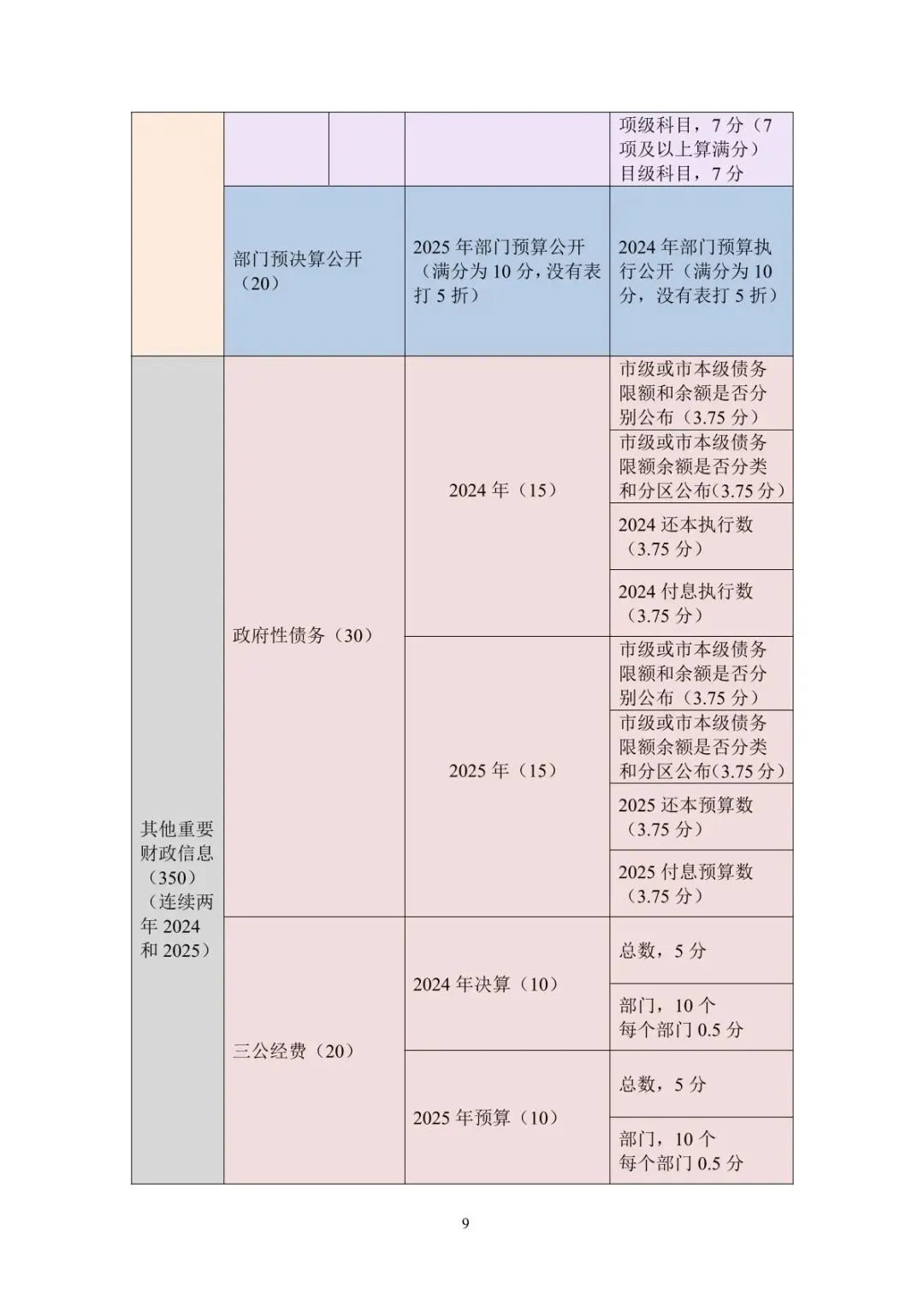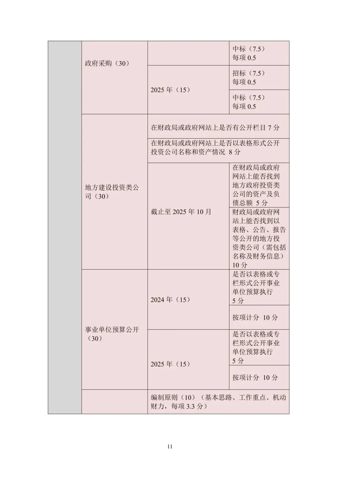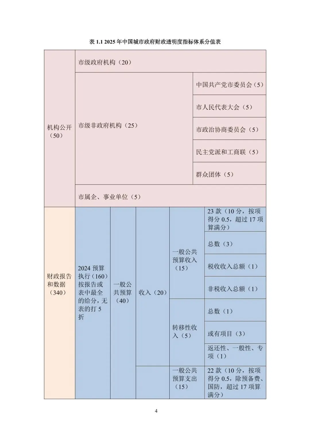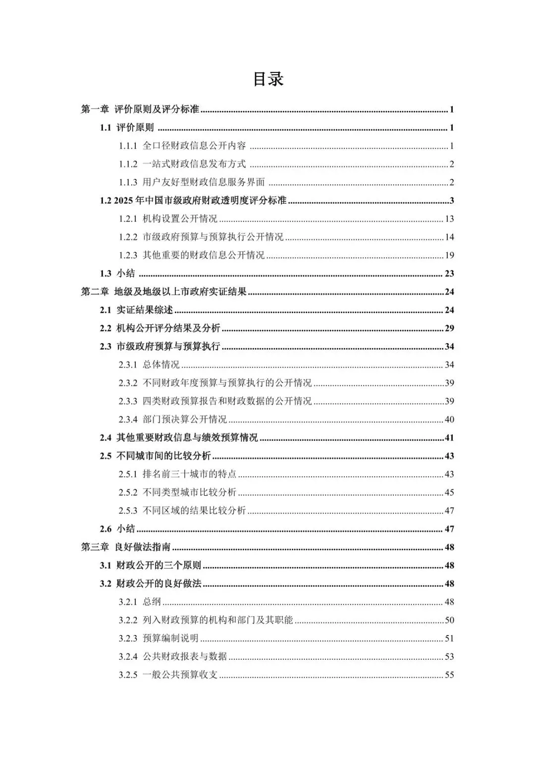 :机构公开平均得分 44.95 分(满分 50 分),83 个城市获满分,市属企事业单位、市级政府机构公开最完善;“四本账” 中一般公共预算(公开率 94.03%)和政府性基金预算(79.80%)公开较完整,国有资本经营预算(50.05%)和社保基金预算(63.60%)相对薄弱;部门预决算公开率达 96.45%,质量显著提升。 - 其他重要财政信息公开不均衡,部分领域亟待加强