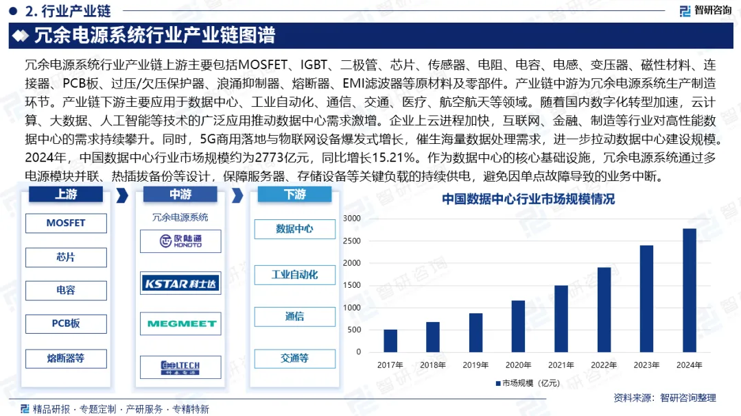 产业链核心节点:随着国内数字化转型加速,云计算、大数据、人工智能等技术的广泛应用推动数据中心需求激增。企业上云进程加快,互联网、金融、制造等行业对高性能数据中心的需求持续攀升。同时,5G商用落地与物联网设备爆发式增长,催生海量数据处理需求,进一步拉动数据中心建设规模。2024年,中国数据中心行业市场规模约为2773亿元,同比增长15.21%。作为数据中心的核心基础设施,冗余电源系统通过多电源模块并联、热插拔备份等设计,保障服务器、存储设备等关键负载的持续供电,避免因单点故障导致的业务中断。
