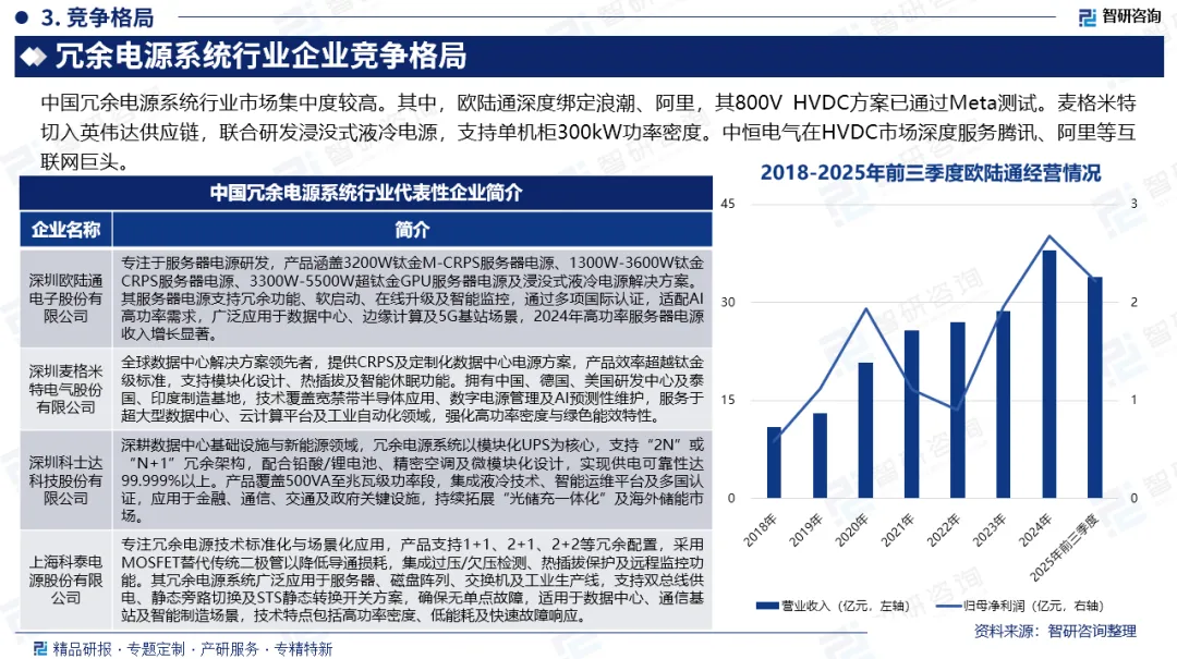 竞争情况:中国冗余电源系统行业市场集中度较高。其中,欧陆通深度绑定浪潮、阿里,其800V HVDC方案已通过Meta测试。麦格米特切入英伟达供应链,联合研发浸没式液冷电源,支持单机柜300kW功率密度。中恒电气在HVDC市场深度服务腾讯、阿里等互联网巨头。