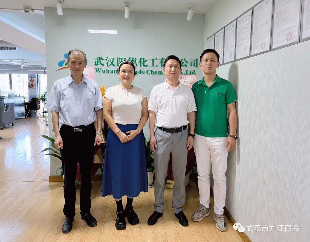 8月18日下午武汉九江商会会长、远光瑞康科技有限公司董事长董林艺和武汉九江商会轮值会长、中山口腔门诊部有限公司董事长闵双龙一起陪同九江市政府驻武汉办事处卢礼敏主任走访调研乡贤企业——武汉阳德化工有限公司。武汉阳德化工有限公司总经理江德英女士热情接待了卢主任、董会长和闵会长一行,详细介绍了企业的发展情况、主营项目等,然后进行亲切交流座谈。
