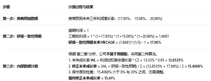 未来保守预期增长率:取券商预测均值(17.85%, 15.08%, 20.96%)的复合增长率。计算得未来三年预测CAGR = ( (1+17.85%)(1+15.08%)(1+20.96%) )^(1/3) - 1 ≈ 17.96%。