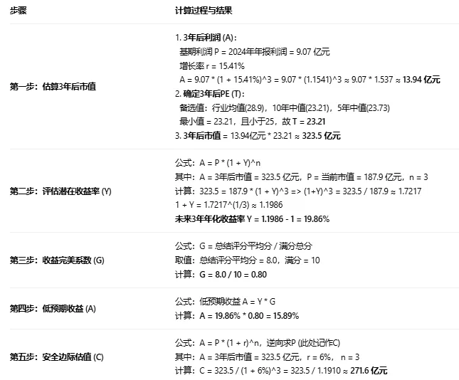 天花板时利润(永续年金对应的期末利润)= 永续年金起点值 * (1+永续增长率) / (折现率 - 永续增长率)。此处采用戈登模型倒推思想,更严谨的估算需详细现金流预测。基于对公司龙头地位和市场空间的判断,进入稳定期后,其“天花板时利润”可看至20亿元以上(约为当前利润的2倍多)。此处我们进行简化估算:若未来5年以13.53%增长,之后以3%永续增长,其终值对应的隐含永续利润可观。基于审慎原则,结合行业研究报告,可暂估 “天花板时利润”字段 ≈ 20.85亿元。