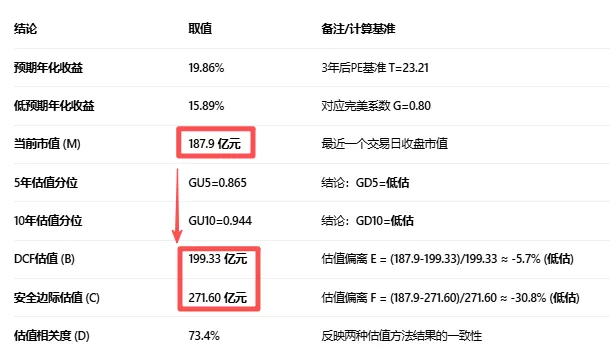 公司当前市值188亿元,根据模型评估比两种估值199亿和272亿均便宜,综合估值评价-13.90%(0.86),相比估值便宜下限-22.5%(0.77),尚需要跌至89.5%附近(0.77/0.86)。即市值168亿左右,股价16.76元(最近日2026-01)附近模型认为绝对便宜。以上内容用于估值演算的模拟思考,不构成投资建议。