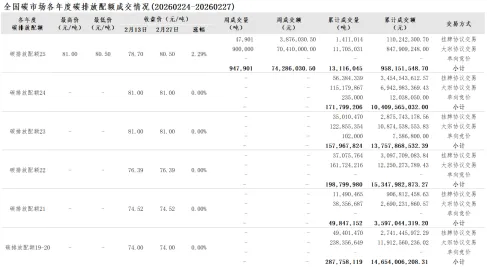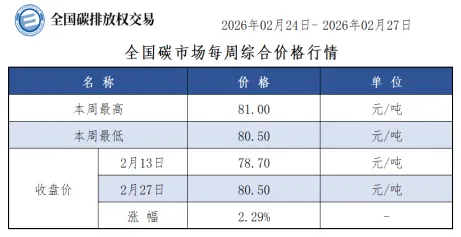 本周全国碳市场综合价格行情为:最高价81.00元/吨,最低价80.50元/吨,收盘价较上周五上涨2.29%。本周挂牌协议交易成交量47,901吨,成交额3,876,030.50元;大宗协议交易成交量900,000吨,成交额70,410,000.00元;本周无单向竞价。本周全国碳排放配额总成交量947,901吨,总成交额74,286,030.50元。2026年1月1日至2月27日,全国碳市场碳排放配额成交量14,421,806吨,成交额1,062,000,282.30元。截至2026年2月27日,全国碳市场碳排放配额累计成交量879,288,326吨,累计成交额58,724,618,513.87元。