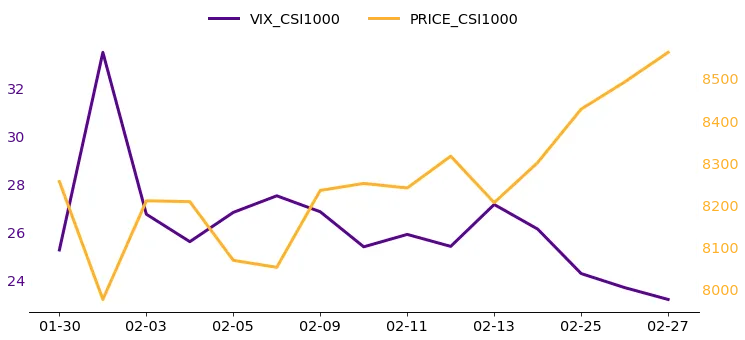 图6和7中,中证1000指数为三大指数中表现最强,月内持续震荡上行,整体涨幅达3.71%,月末报收8560.84点,尤以月末加速上涨明显。VIX指数月初冲高至约34后大幅回落,此后在24-28区间低位运行,月末进一步下行至约23的全月低位;SKEW指数全月维持负值,月初深入-0.5附近,随后震荡回升,月末收于约-0.2。三指数SKEW走势总体方向一致,均经历月初深度负值后逐步回升收敛,反映市场情绪整体趋稳,但对下行风险的保护需求仍未完全消散。