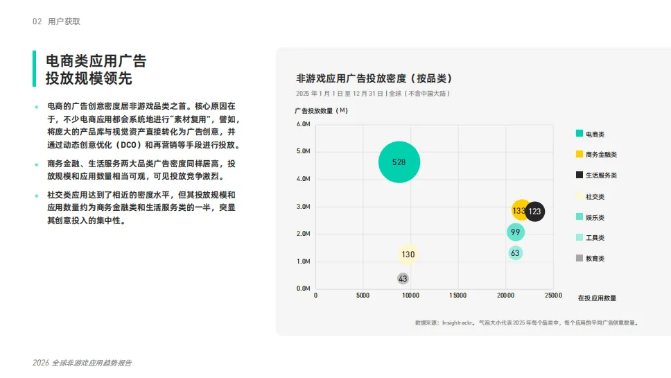 Mintegral与Insightrackr联合发布的2026年全球非游戏应用趋势报告,基于2025年全球超100个主要市场(不含中国大陆)的数据分析,揭示了非游戏应用行业围绕信任、自动化和沉浸式体验发展的核心趋势,指出行业竞争已从单点突破转向系统性增长,高效获客与可持续变现成为核心挑战。