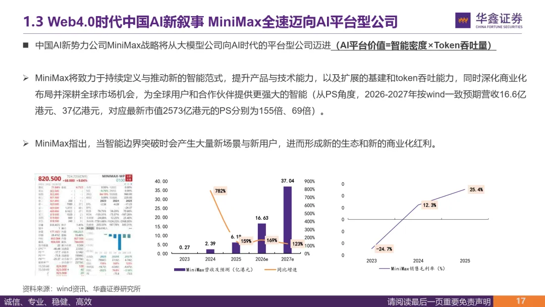 华鑫证券 2026 年 3 月 5 日发布的传媒行业深度报告指出,Web4.0 作为互联网发展新阶段,以智能为核心驱动力,凭借 AI、区块链等多技术融合构建沉浸式智能网络,推动人工智能从工具向自主决策的智能体演进,带来生产力与生产关系的范式革命,同时 Web4.0 正逐步向侧重情感交互的 Web5.0 过渡,而中国 AI 新势力表现亮眼,MiniMax 在全球 AI 模型 Token 市场份额位列第三,正从大模型公司向平台型企业转型。————