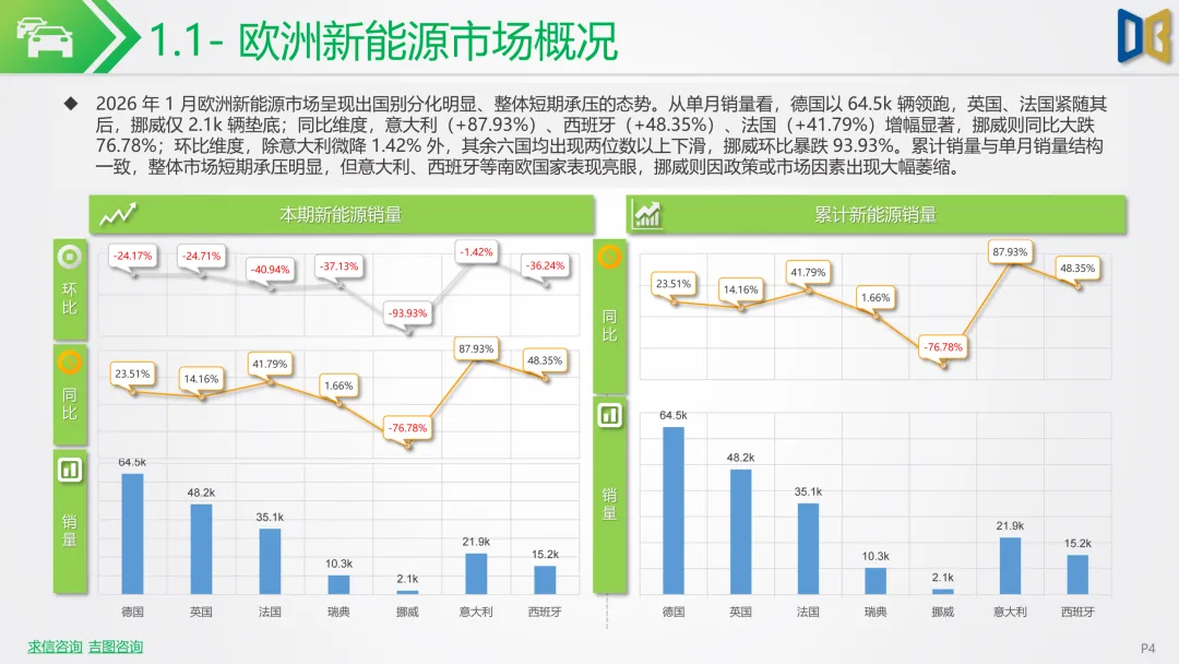2026年1月欧洲新能源市场呈现出国别分化明显、整体短期承压的态势。从单月销量看,德国以64.5k辆领跑,英国、法国紧随其后,挪威仅2.1k辆垫底;同比维度,意大利(+87.93%)、西班牙(+48.35%)、法国(+41.79%)增幅显著,挪威则同比大跌76.78%;环比维度,除意大利微降1.42%外,其余六国均出现两位数以上下滑,挪威环比暴跌93.93%。累计销量与单月销量结构一致,整体市场短期承压明显,但意大利、西班牙等南欧国家表现亮眼,挪威则因政策或市场因素出现大幅萎缩。