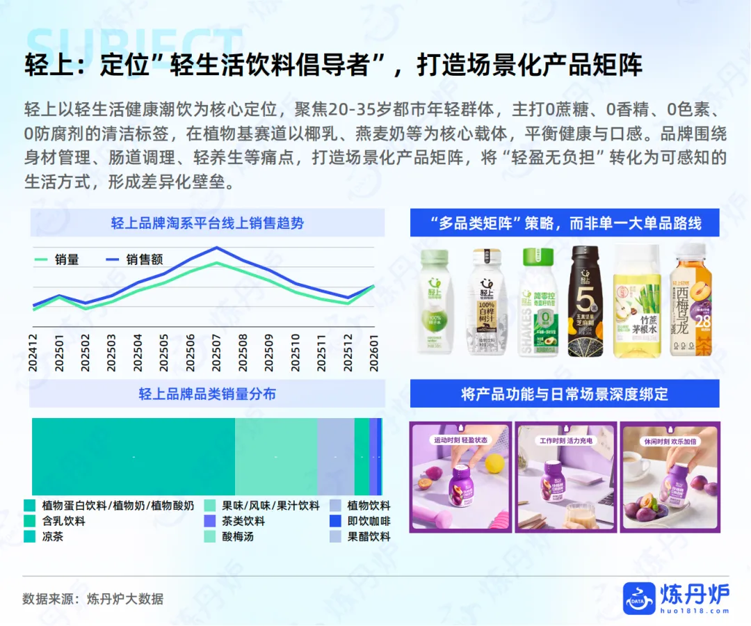 轻上以轻生活健康潮饮为核心定位,聚焦20-35岁都市年轻群体,主打0蔗糖、0香精、0色素、0防腐剂的清洁标签,在植物基赛道以椰乳、燕麦奶等为核心载体,平衡健康与口感。品牌围绕身材管理、肠道调理、轻养生等痛点,打造场景化产品矩阵,将“轻盈无负担”转化为可感知的生活方式,形成差异化壁垒。