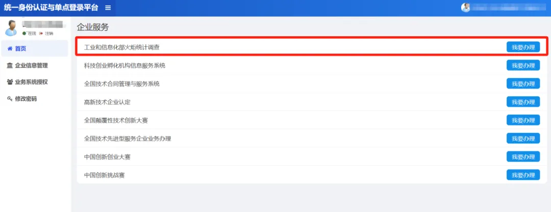 账号登录后,进入“企业服务”菜单,选择“工业和信息化部火炬统计调查”事项,点击“我要办理”。