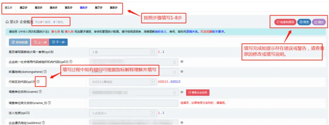 ①按步骤填写1-8步,不要有缺漏项;②填写过程中对指标有疑问,可点击“问号”根据指标解释理解并填写;③如填写完成点击“检查和原因”,根据提示进行系统修改或警告解释说明。