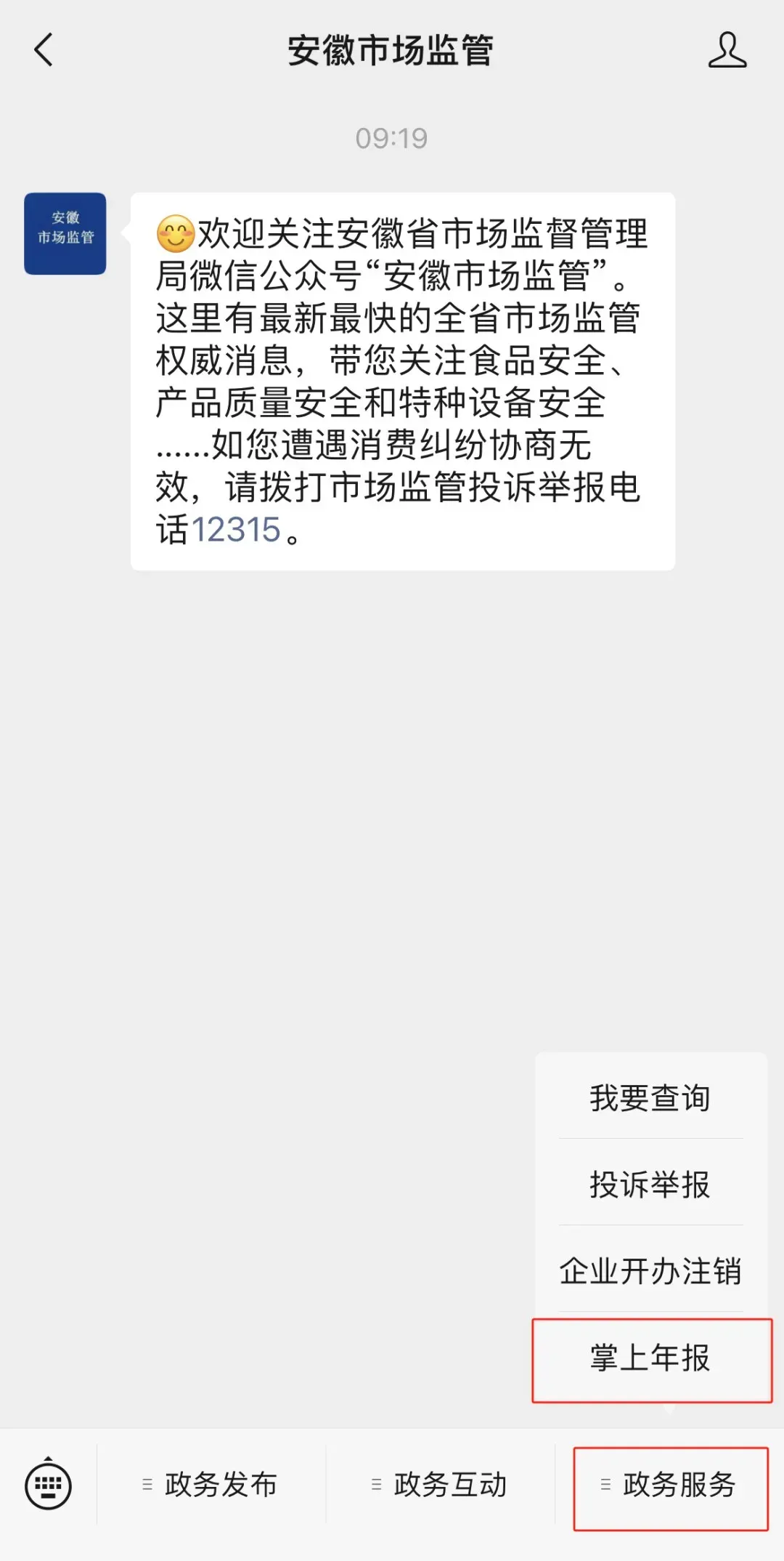 ② 关注“安徽市场监管”微信公众号(政务服务→掌上年报)报送年度报告;