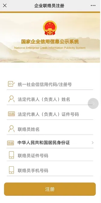 1、如果首次在公示系统填报,点击 “注册”按钮,按照页面提示填写对应信息后点击保存。注册完毕会提示“注册成功”字样。