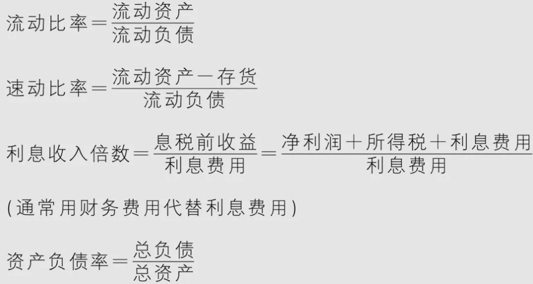 流动资产扮演的两个角色:为企业偿还流动负债做准备、为企业日常运营提供流动资金。 所以,若一家公司的流动比率为1,肯定是不行的(流动资产不能全部拿去偿还债务,不然就没钱维持公司运营了。在美国,健康公司的流动比率大多在3~4之间。 在中国,企业的流动比率一般在1~2之间。 原因是,在中国,企业往往不需要靠变现流动资产来偿还短期借款,而是用新的借款来偿还旧的借款,借款本身实现了自我循环。(但是一旦行业完蛋,银行不愿意借款给企业,那就全完了。)因此,虽然用流动资产除以流动负债得到的流动比率可能很低,但用流动资产除以扣除短期负债后的流动负债,得到的流动比率就没那么低了。不能用非流动资产去除以长期负债的方法衡量长期偿债能力,因为企业不可能把厂房、设备、品牌都卖了去偿债,因为这样子公司没法运转,相当于就关门了。息税前收益(EBIT):扣除利息、所得税之前的利润。又称已获利息倍数,用以衡量偿还借款利息的能力。用这个比率来衡量企业在扣除利息和所得税之前的盈利足够它偿还几次利息。资产负债率——财务杠杆