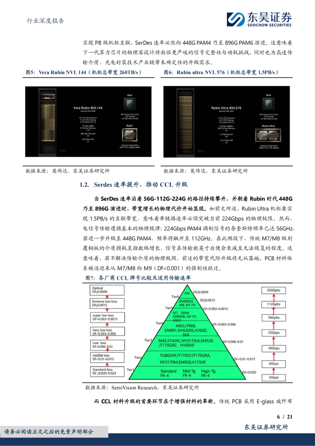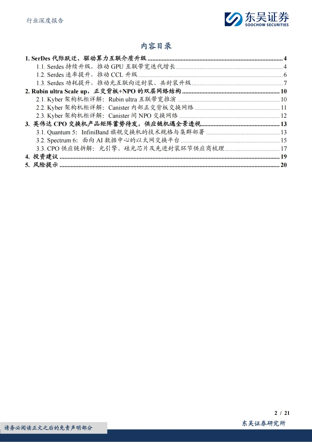 重点关注2026年M9产业链、光互联产业链投资机遇。本系列首篇报告《AI基建,光板铜电—光&铜篇,主流算力芯片Scale up&out方案全解析》深度解析了2026年四款核心算力芯片的Scale-up与Scale-out组网架构,并量化测算了AI服务器中PCB、高速铜缆、光模块等信号传输介质的结构配比。本篇作为系列第二篇,暨GTC 2026大会前瞻,我们立足英伟达SerDes技术演进,前瞻推演2026-2027年整机柜架构及CPO产业化进程。穿透产业链繁杂噪音,本报告纯粹从技术底层出发,系统剖析了SerDes迭代面临的速率瓶颈与功耗约束,从而判断出PCB材料向M9等级升级、光电共封装及"光入柜内"的确定性技术趋势。因此我们建议2026年重点关注PCBM9材料产业链投资机遇,以及CPO、光入柜内所对应的光芯片、光器件等领域的投资机遇。