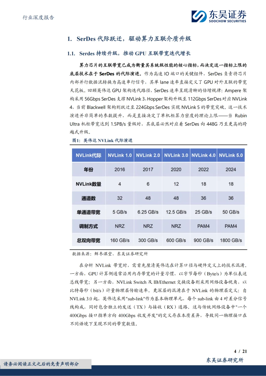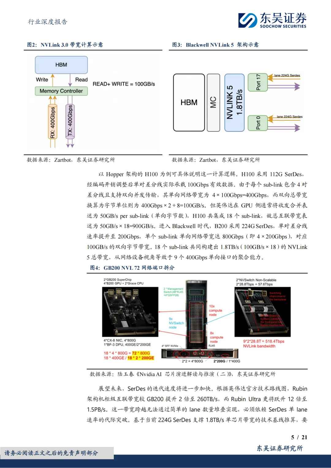 SerDes代际跃迁,驱动算力互联介质升级。算力芯片的互联带宽已成为衡量其性能的核心指标,而SerDes(高速串行解串器)作为高速IO端口的核心技术组件,其速率迭代直接决定了芯片互联带宽的上限。以英伟达为例,NVLink SerDes已从Ampere架构的56Gbps演进至Blackwell架构的224Gbps,支撑单芯片互联带宽实现代际跨越。然而,SerDes速率的持续提升对AI服务器,交换机的信号传输介质提出严苛挑战。从速率瓶颈看,224G以上信号高频衰减剧增,驱动PCB覆铜板向M9级别升级;从功耗瓶颈看,SerDes功耗占比随速率攀升,光互联亟需通过光电近封装、共封装技术缩短与交换芯片的物理距离,以替代传统可插拔方案,实现能效跃升。