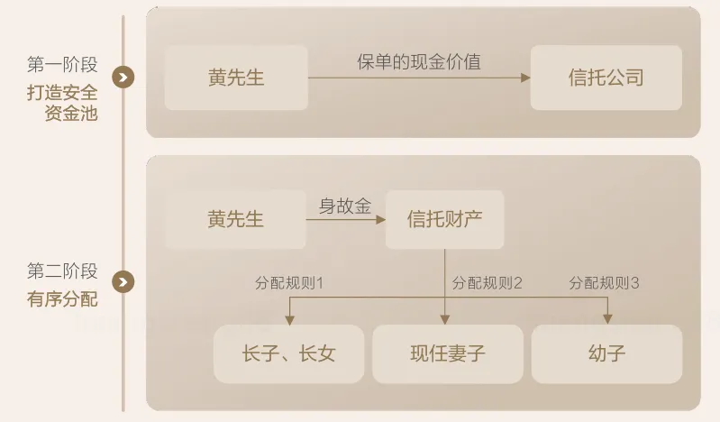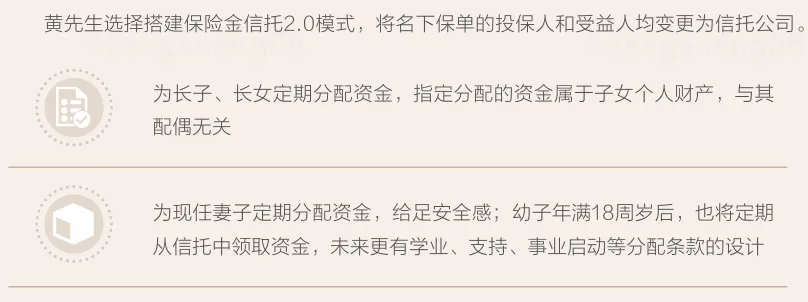 以上两点需求,都可以通过设立信托的方式来实现,黄先生可以把名下的大额保单设立成保险金信托,利用信托的独立属性和特色化分配条款,这样既能留住安全的资金池,又能对三个孩子进行有序的资金分配。