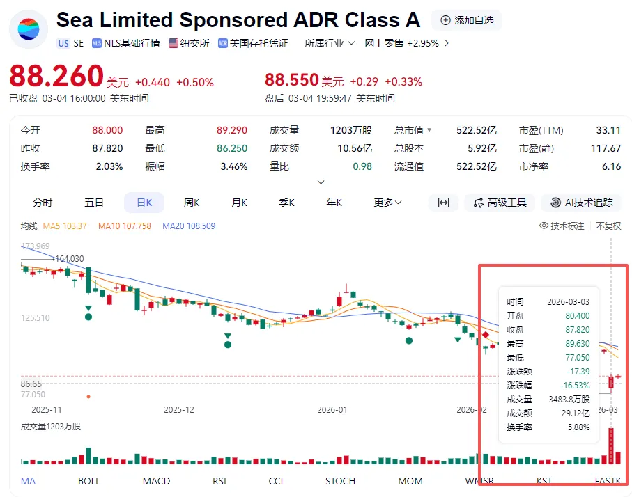 但资本市场的反应,却给了所有乐观者一记闷棍——财报发布后,Sea股价盘前暴跌16%,一度下探至88美元。