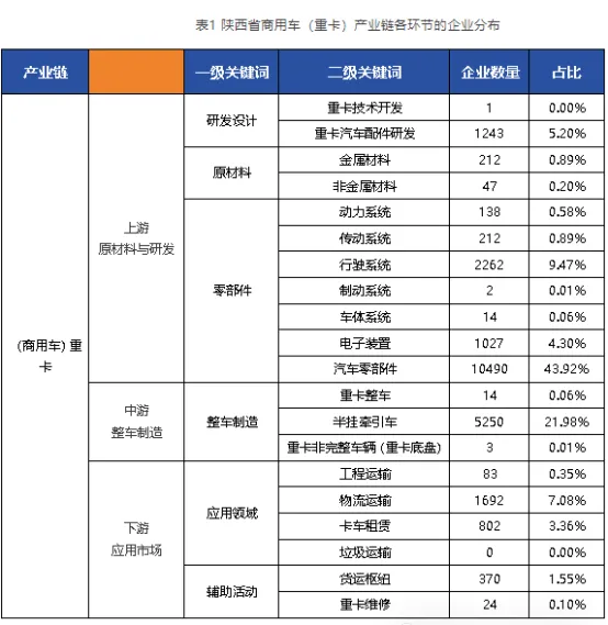 企业主要集中在上游原材料与研发的汽车零部件领域,占比32.8%;中游整车制造以半挂牵引车为主,占比65.7%;下游应用及服务领域企业聚集较少,占比 11.5%。陕西省商用车(重卡)产业链以西安经开区为核心,辐射宝鸡、咸阳、铜川等地,形成“龙头引领+集群配套”的产业格局,依托陕汽、法士特、汉德车桥等链主企业带动,产业链韧性持续增强、集群效应凸显。未来需进一步通过技术创新、国际化拓展及政策协同,巩固全国重卡产业集群的领先地位。