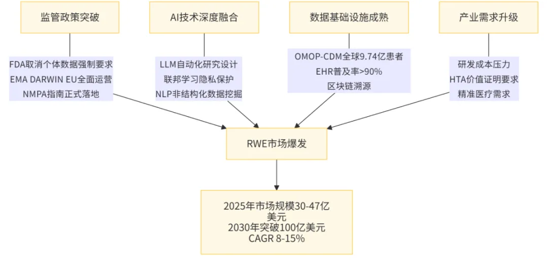真实世界研究的爆火是政策、技术、市场、数据四重因素共振的必然结果。2025年FDA的历史性政策松绑、AI技术的深度融合、OMOP-CDM全球基础设施的成熟,以及制药企业对研发效率和准入证明的迫切需求,共同推动了这一市场的爆发式增长。