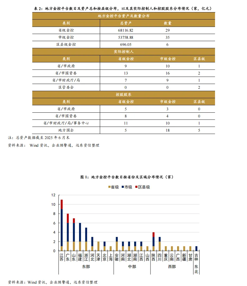 (2)地市级金控平台:共 35 家,半数由地方国企控股,而非市政府、市国资委或市财政局直接控制,外部支持力度相对较弱。展业范围多集中于地市内部,受区域金融资源禀赋制约,平台间分化显著。部分强地市平台表现突出,如成都、广州、苏州等地个别平台资产规模已超万亿元;广州、东莞、武汉、南京等地部分平台总资产在1000亿至2200亿元之间;其余平台则普遍不足千亿元,个别甚至低于百亿元,整体发展格局尚未稳定。