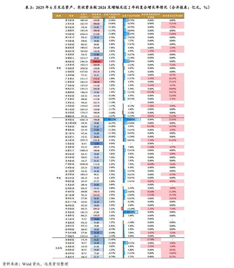 从实收资本看,2023年6月末至2025年6月末,超半数金控实收资本实现增长。省级层面,湖北宏泰、山东财金、新疆金投增幅居前,近两年复合增长率分别为89.09%、73.21%和53.34%;市级层面,武汉金控、苏州国发、中原金控增长较快,复合增长率分别为61.43%、37.84%和35.59%。